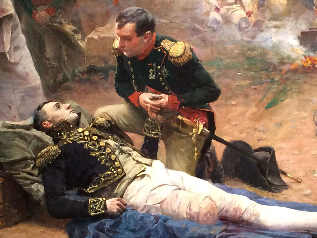 À Essling, il a la cuisse broyée par unboulet, le 22 mai 1809 au soir de la bataille,