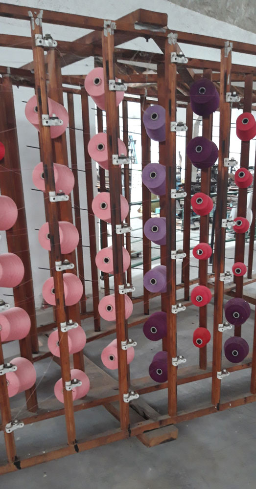 Présentoir de bobines de laine filées de différents titres et de différentes couleurs