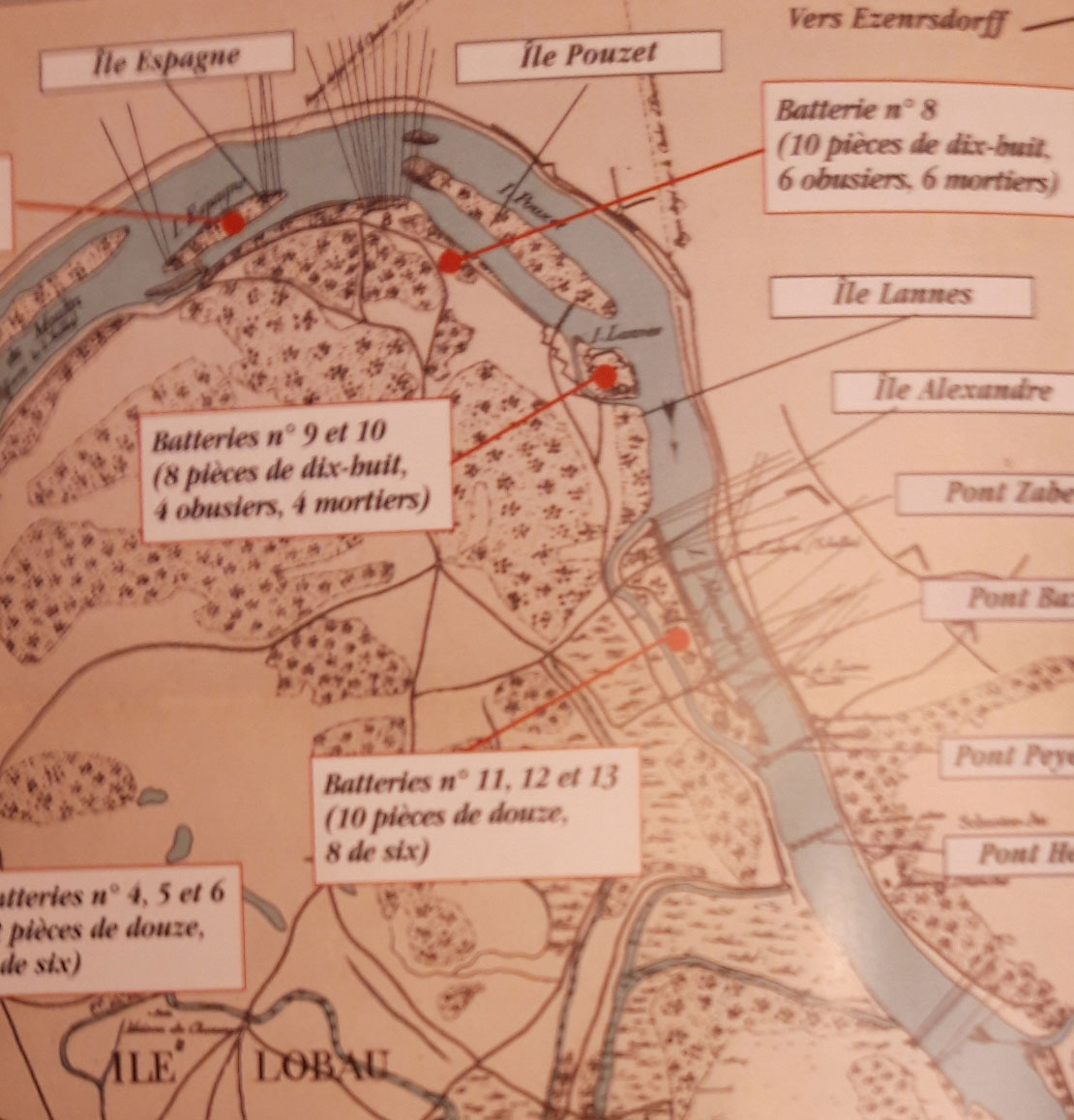 Dispositif de l'artillerie avant Wagram. Sur ce dessin de l'île Lobau, on peut voir les îles Lannes et Pouzet.