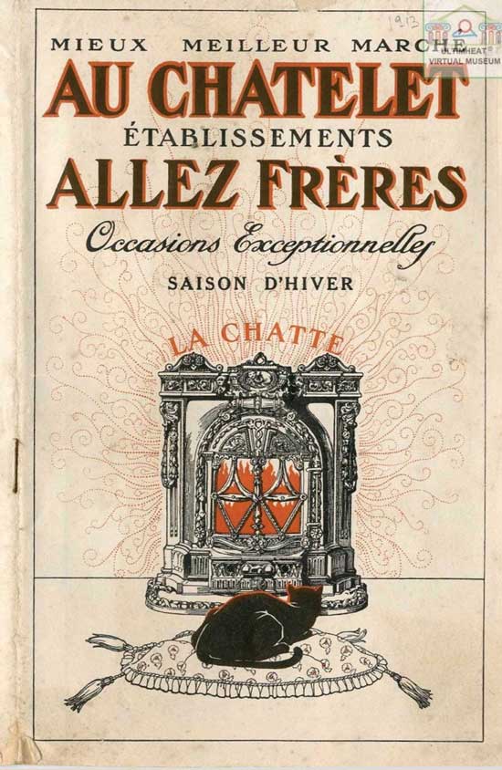Le poêle présenté dans cette affiche, avec sa poignée recouverte de porcelaine en face avant, sa porte à mica, sa roulette frein sous l'appareil et son tiroir cendrier avec des manettes de réglage ressemble au modèle de salamandre Louis XV avec cependant un décor de la porte devant les micas très différent.