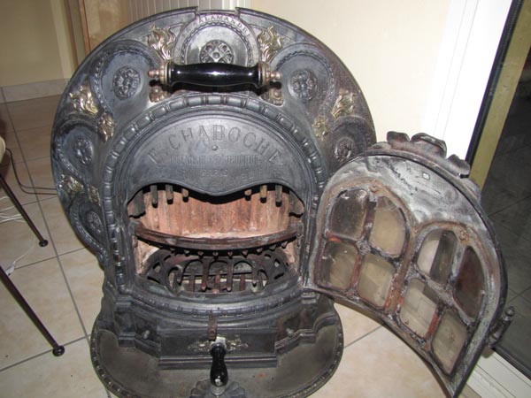 La salamandre Chaboche premier modèle est très bien mise en valeur devant la cheminée du studio